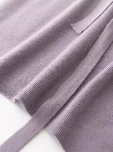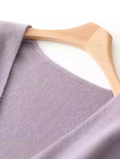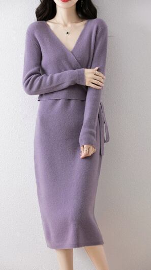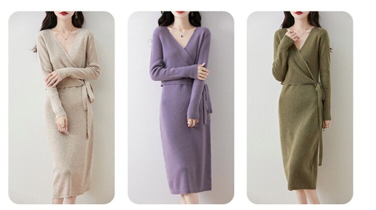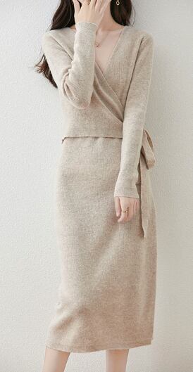 フレンチVネック 100%ウール ニットワンピース レディース 上品リボン付きロング丈 高見え長袖デザイン