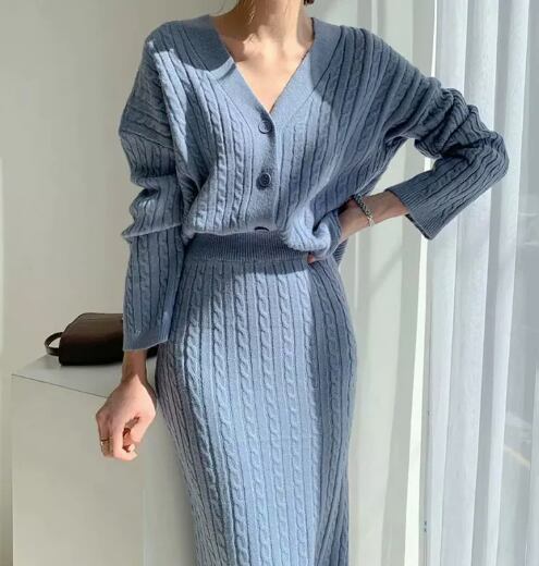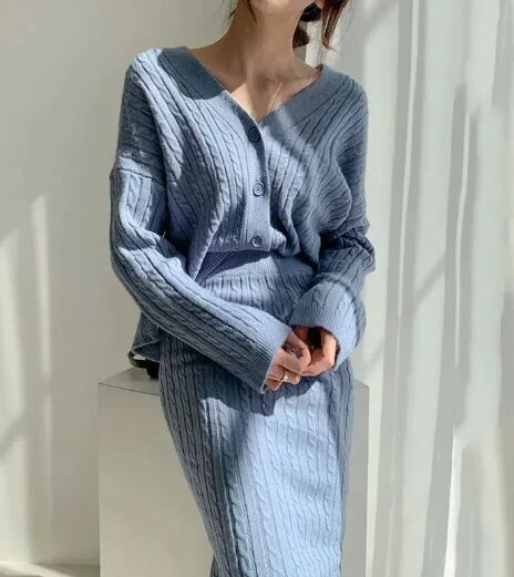 ケーブル編みゆるニットセットアップ 上品で大人かわいい【ブルー】